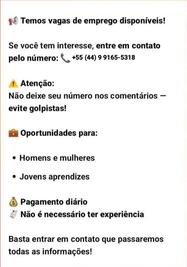 Temos a vaga *20 VAGAS DE AJUDANTE GERAL (COMÉRCIO): Não necessita de experiência.*